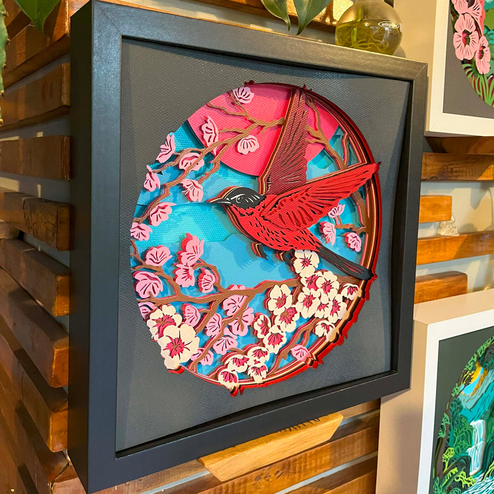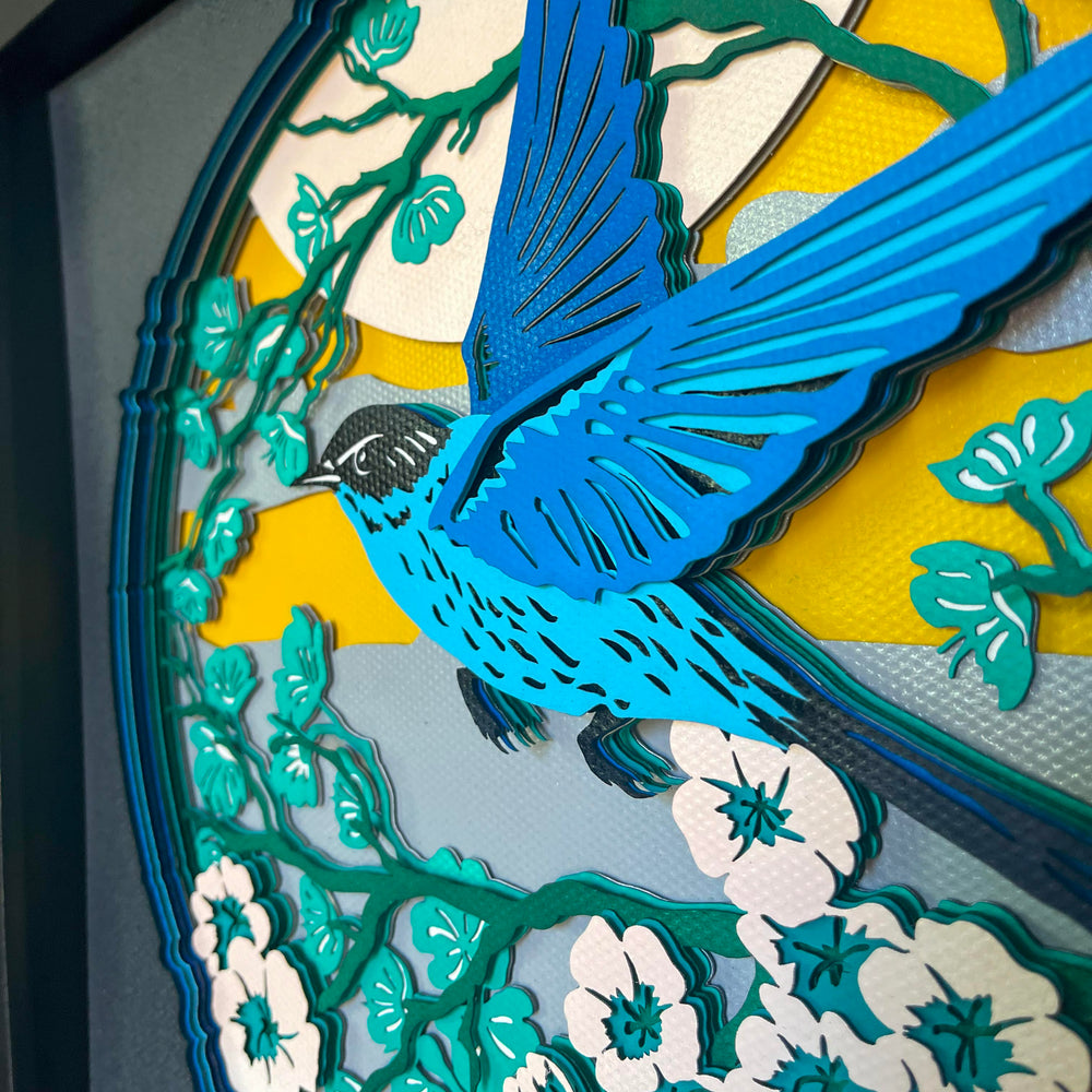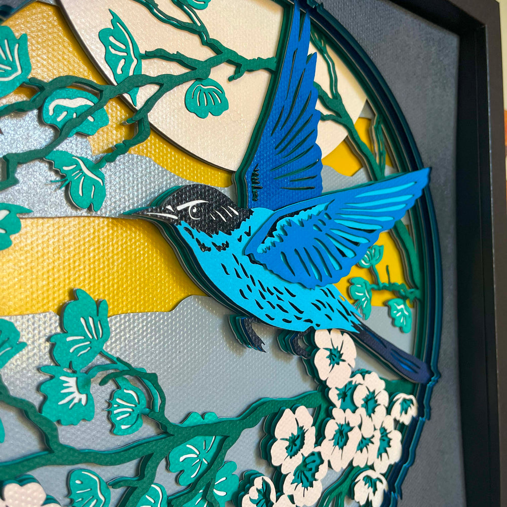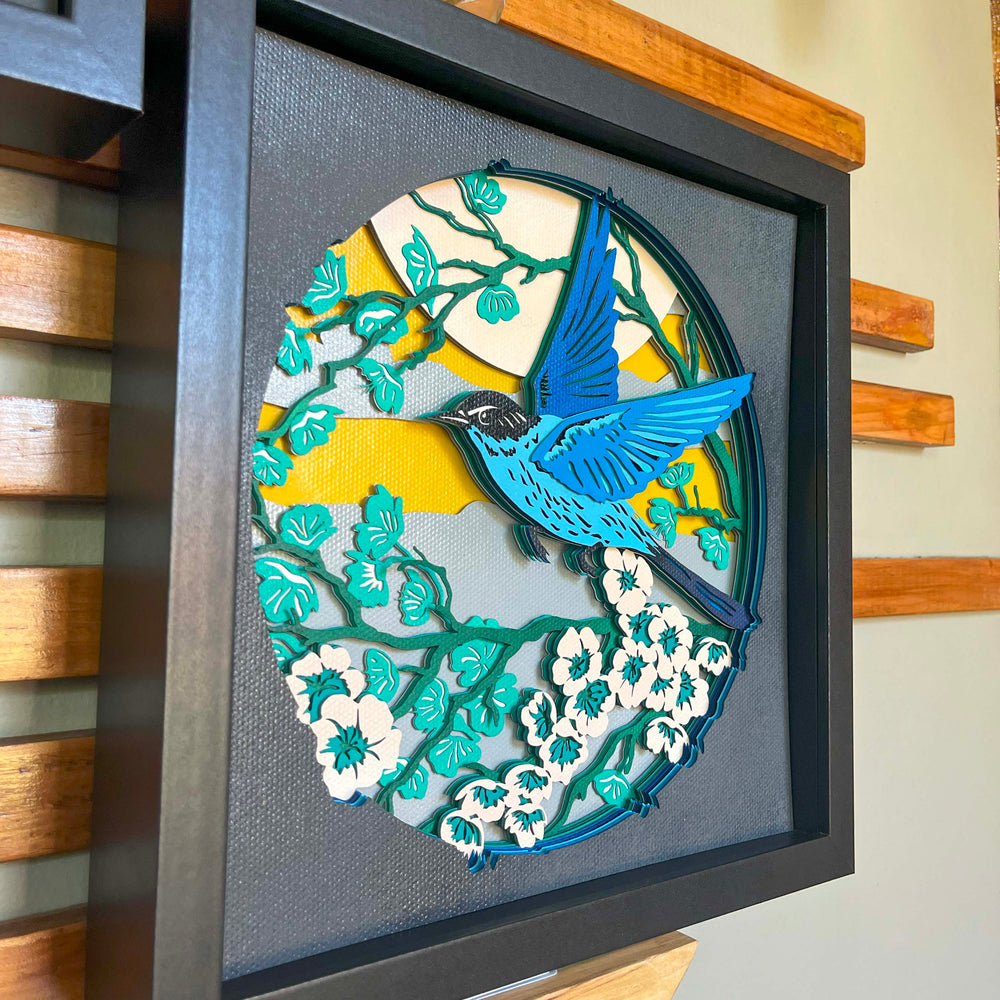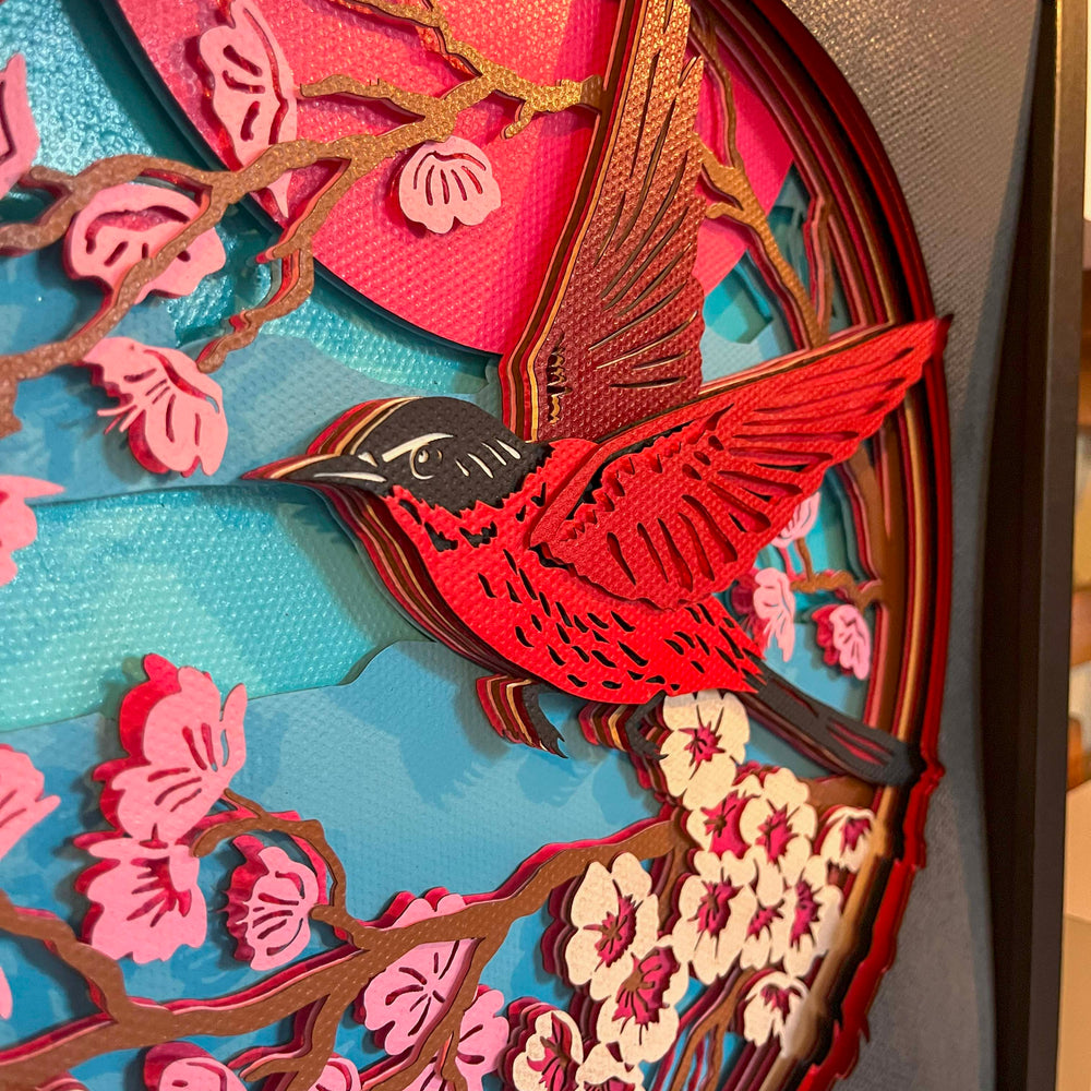 Capas de papel acuarela de alta calidad, cortadas con precisión láser, pintadas con aerosol y ensambladas a mano.
