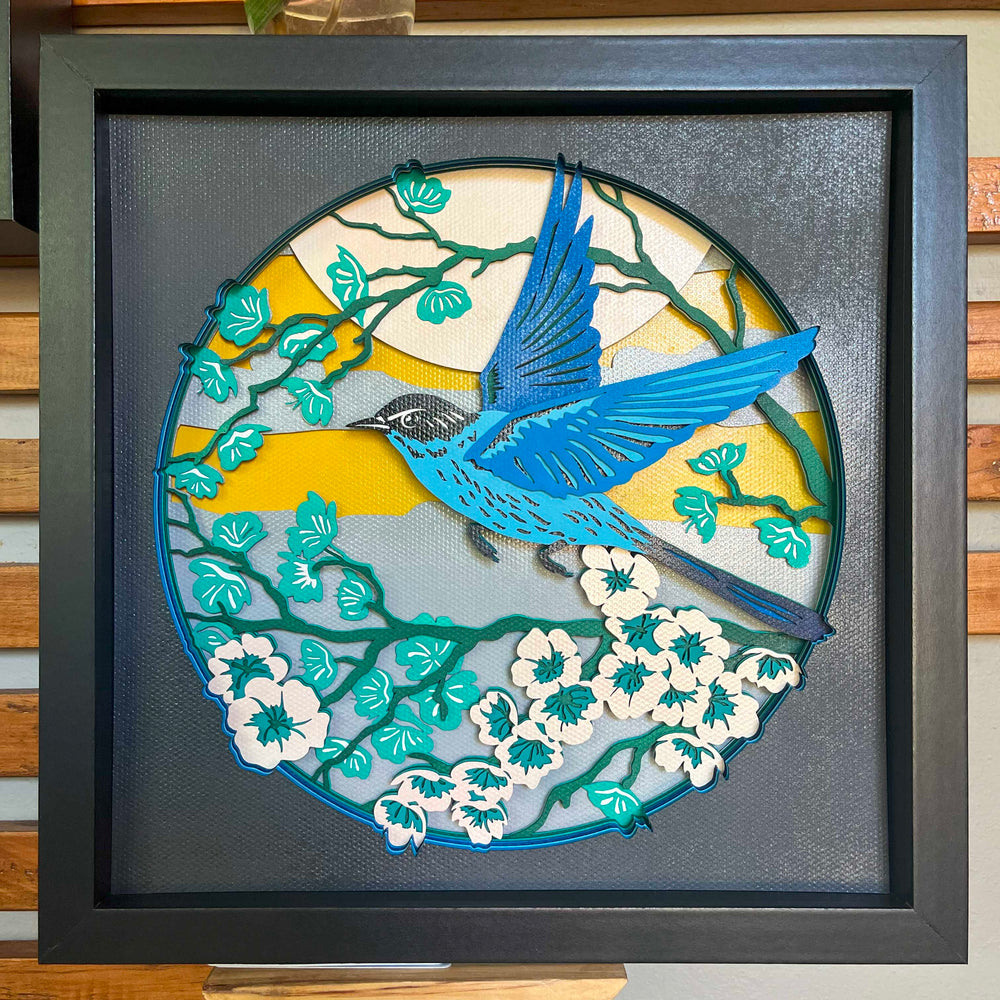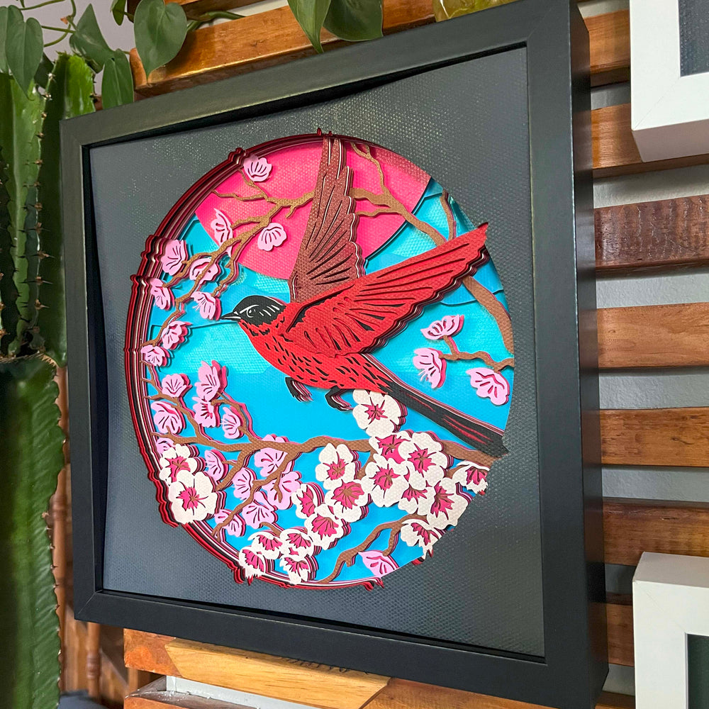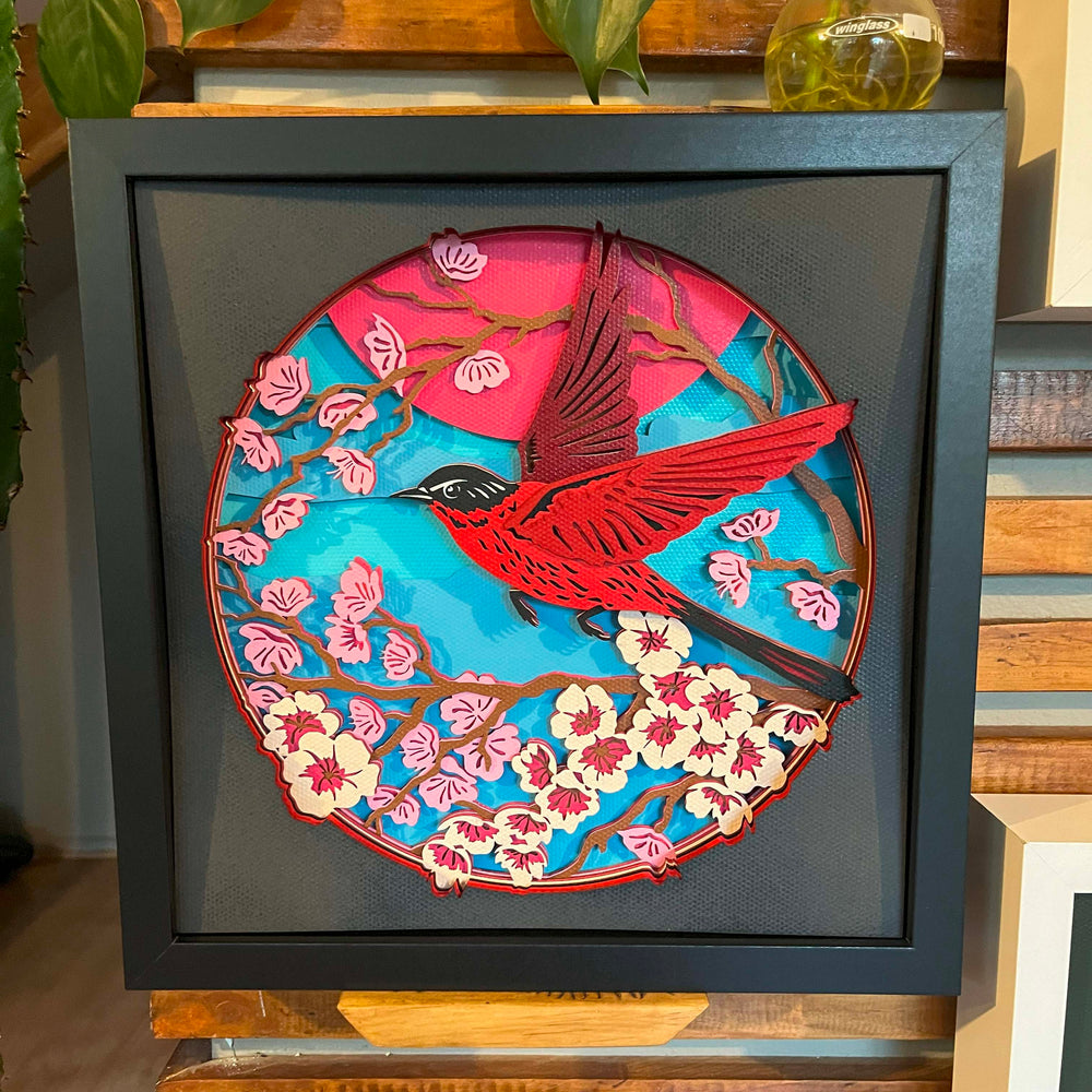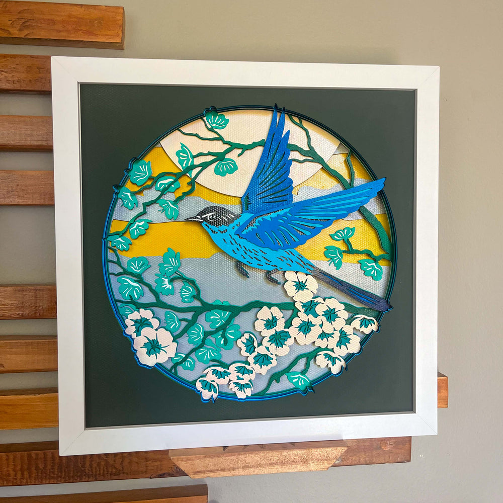 Capas de papel acuarela de alta calidad, cortadas con precisión láser, pintadas con aerosol y ensambladas a mano.
