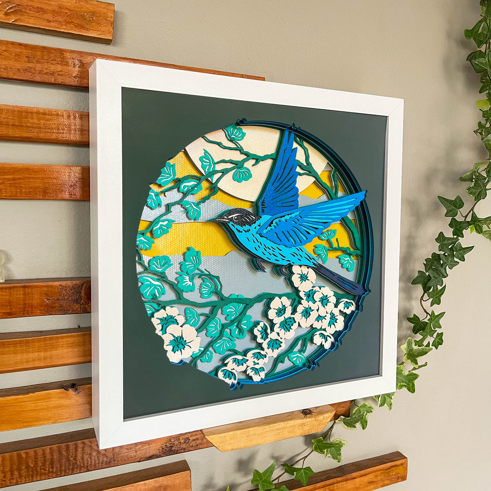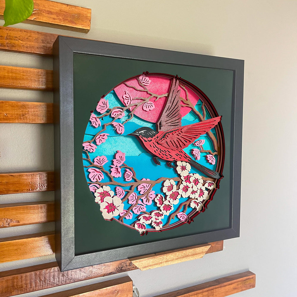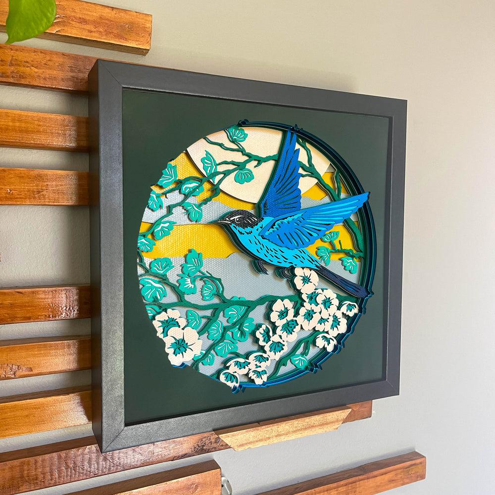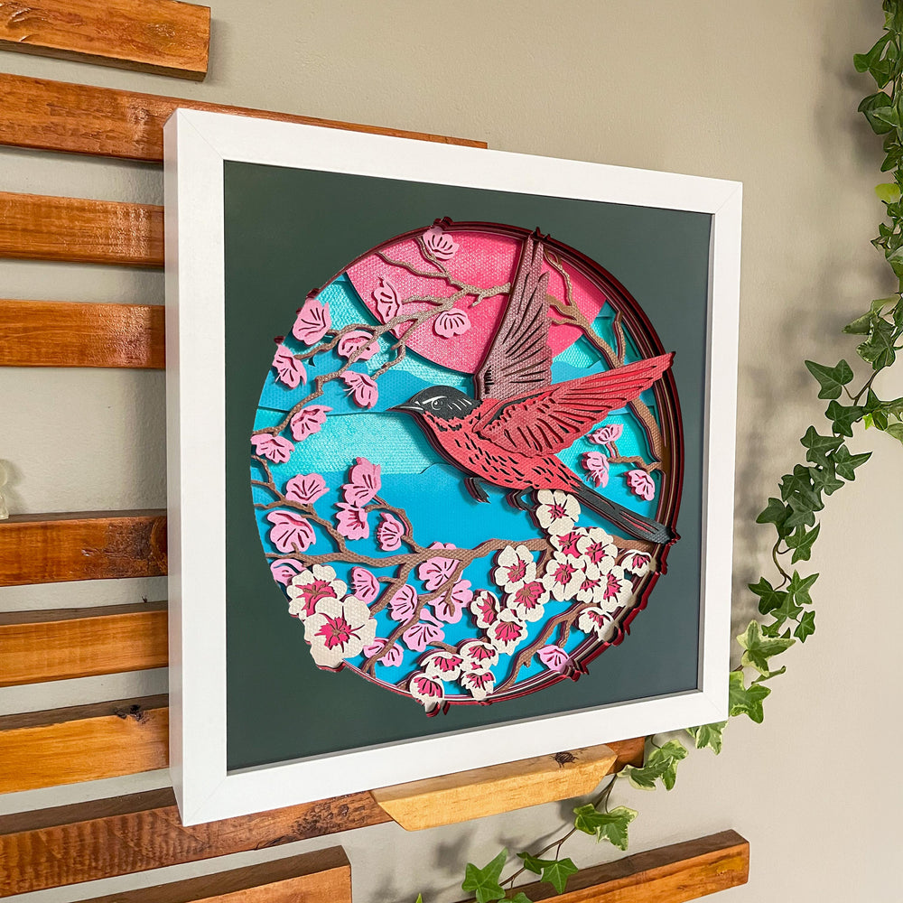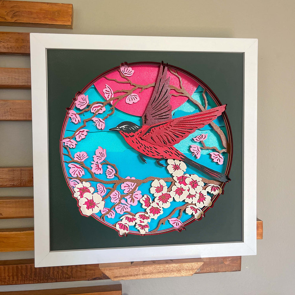 Capas de papel acuarela de alta calidad, cortadas con precisión láser, pintadas con aerosol y ensambladas a mano.