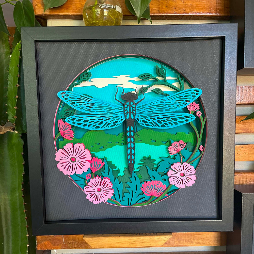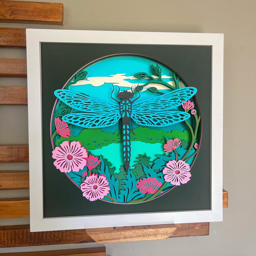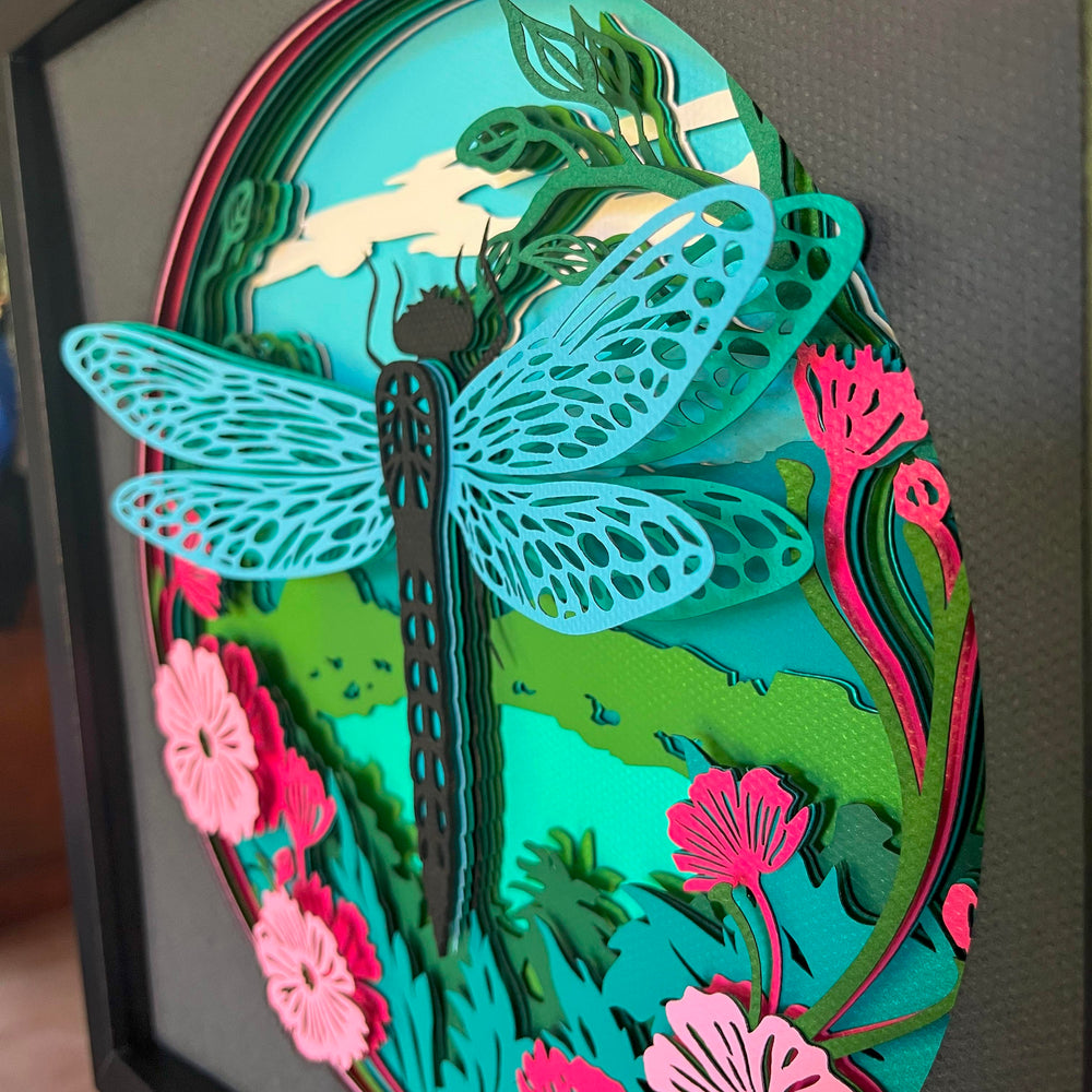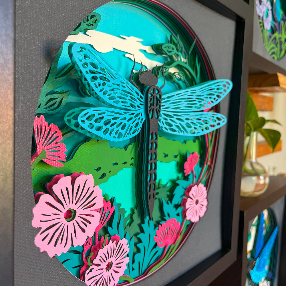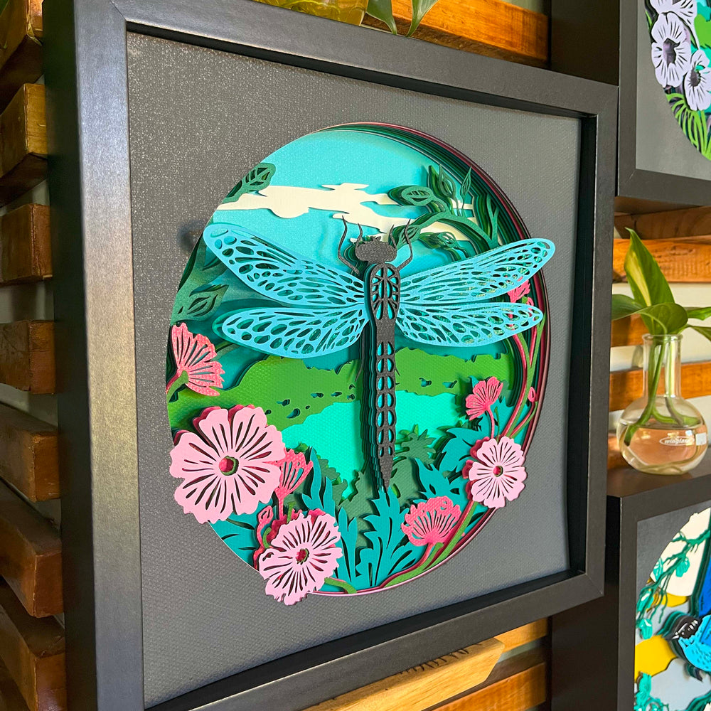 Capas de papel acuarela de alta calidad, cortadas con precisión láser, pintadas con aerosol y ensambladas a mano.