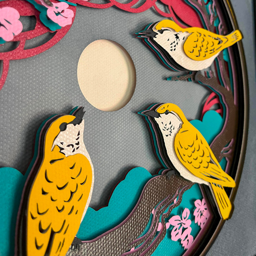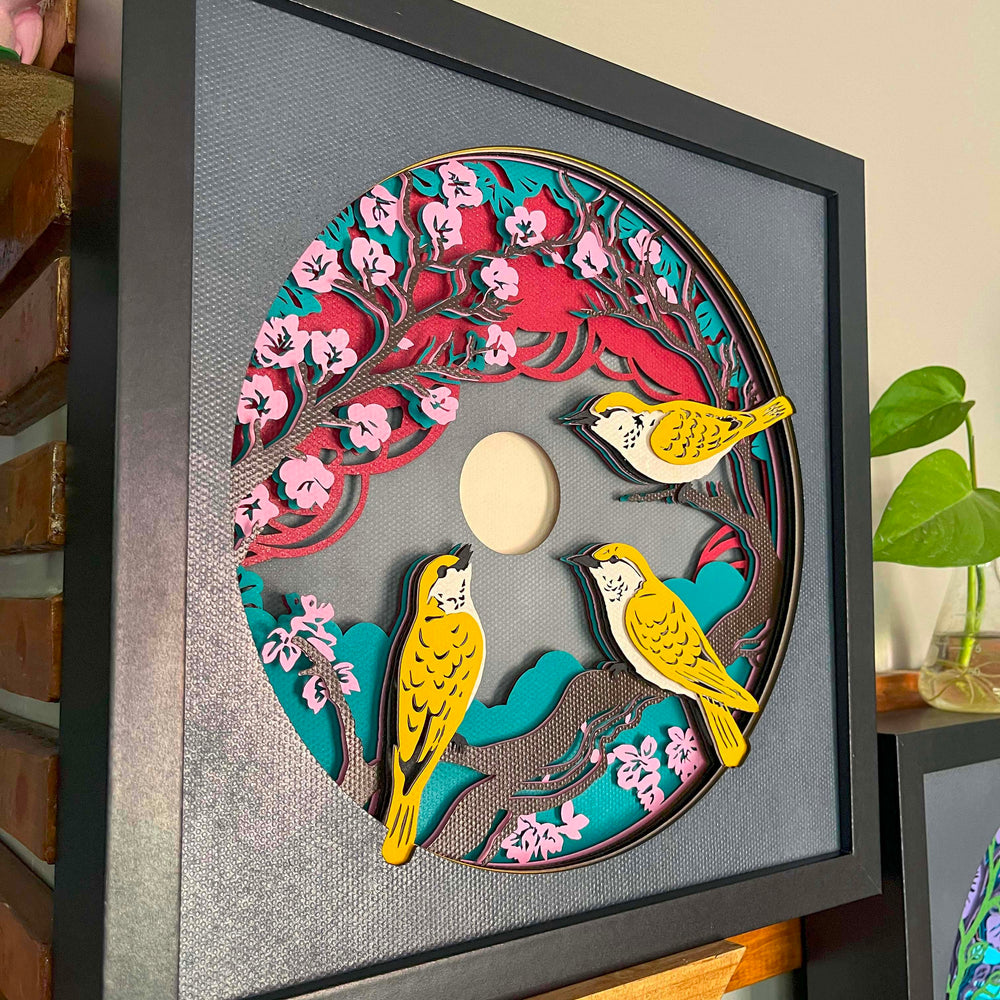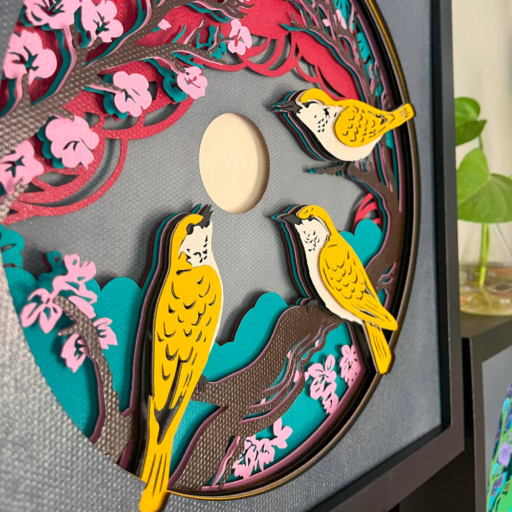 Capas de papel acuarela de alta calidad, cortadas con precisión láser, pintadas con aerosol y ensambladas a mano.
