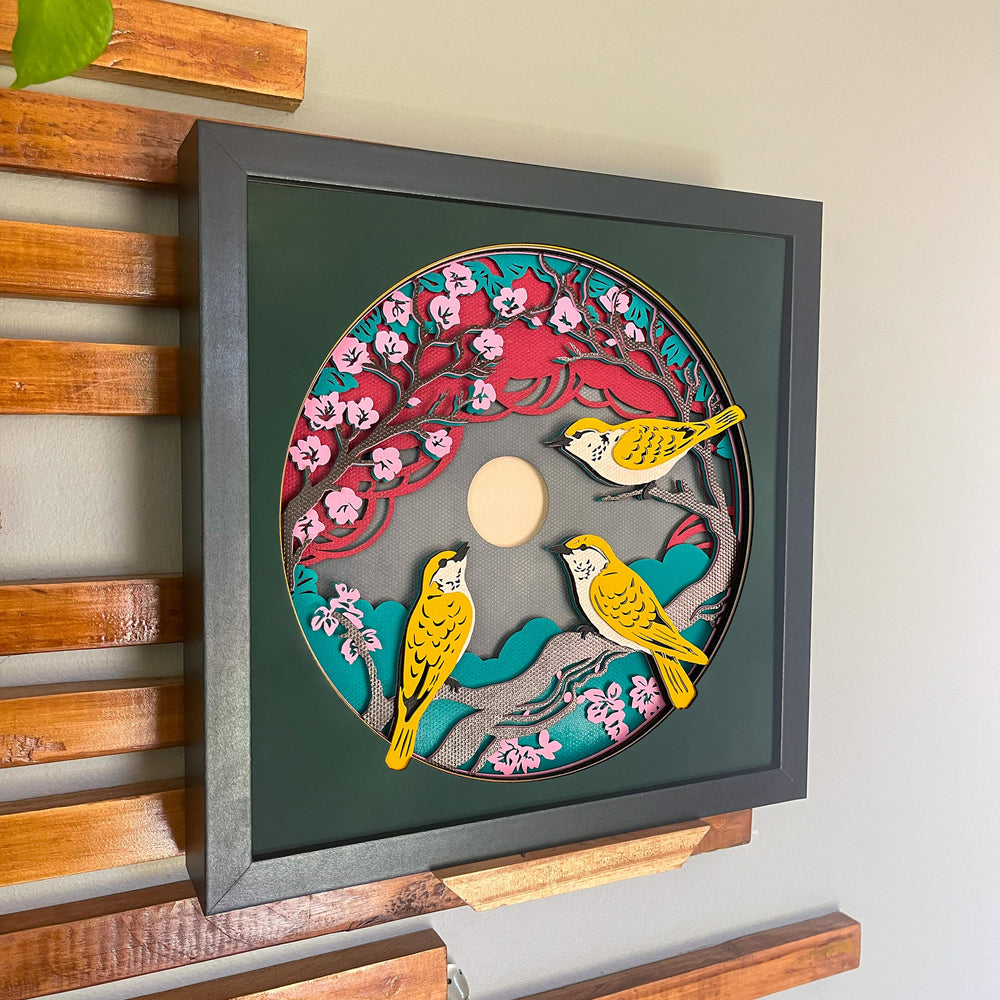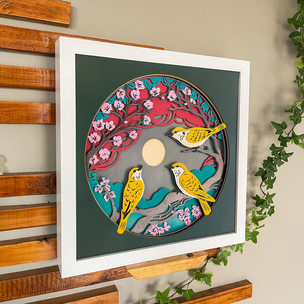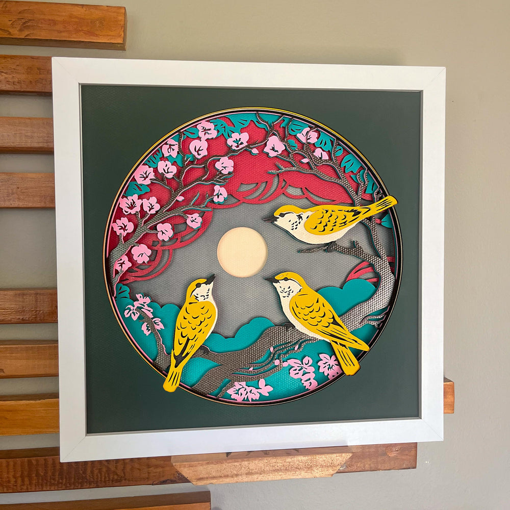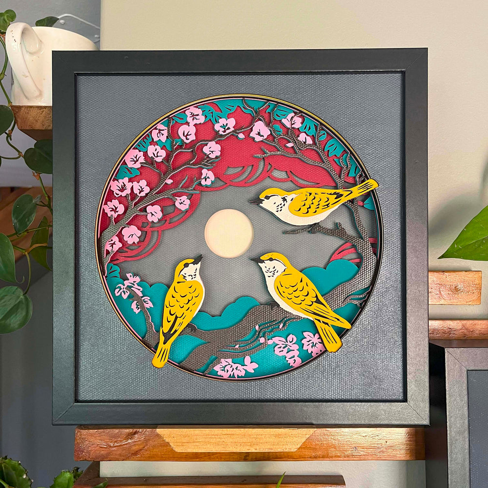 Capas de papel acuarela de alta calidad, cortadas con precisión láser, pintadas con aerosol y ensambladas a mano.